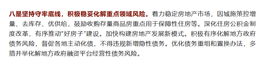 本次会议,房地产估计内容被列入“积极稳健化解要点领域风险”的任务项。也即是说,房地产仍是待化解风险的要点领域之一。